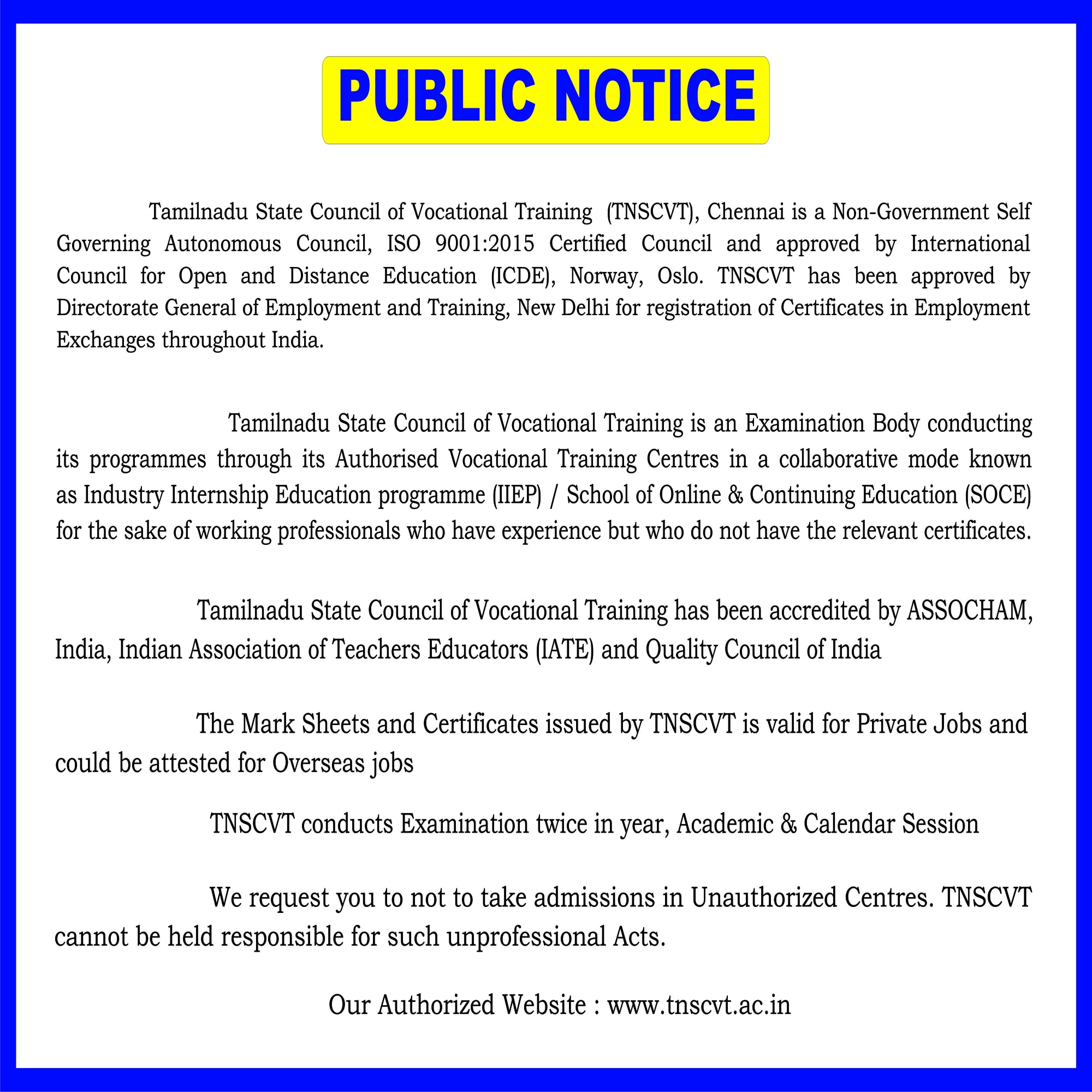 Tamilnadu State Council of Vocational Training (TNSCVT) is an ISO 9001:2015 Certified Council and approved by International Council for Open and Distance Education (ICDE), Norway, Oslo (A Quasi-Government Organisation). TNSCVT has been approved by Directorate General of Employment and Training, New Delhi for registration of Certificates in Employment Exchanges throughout India.